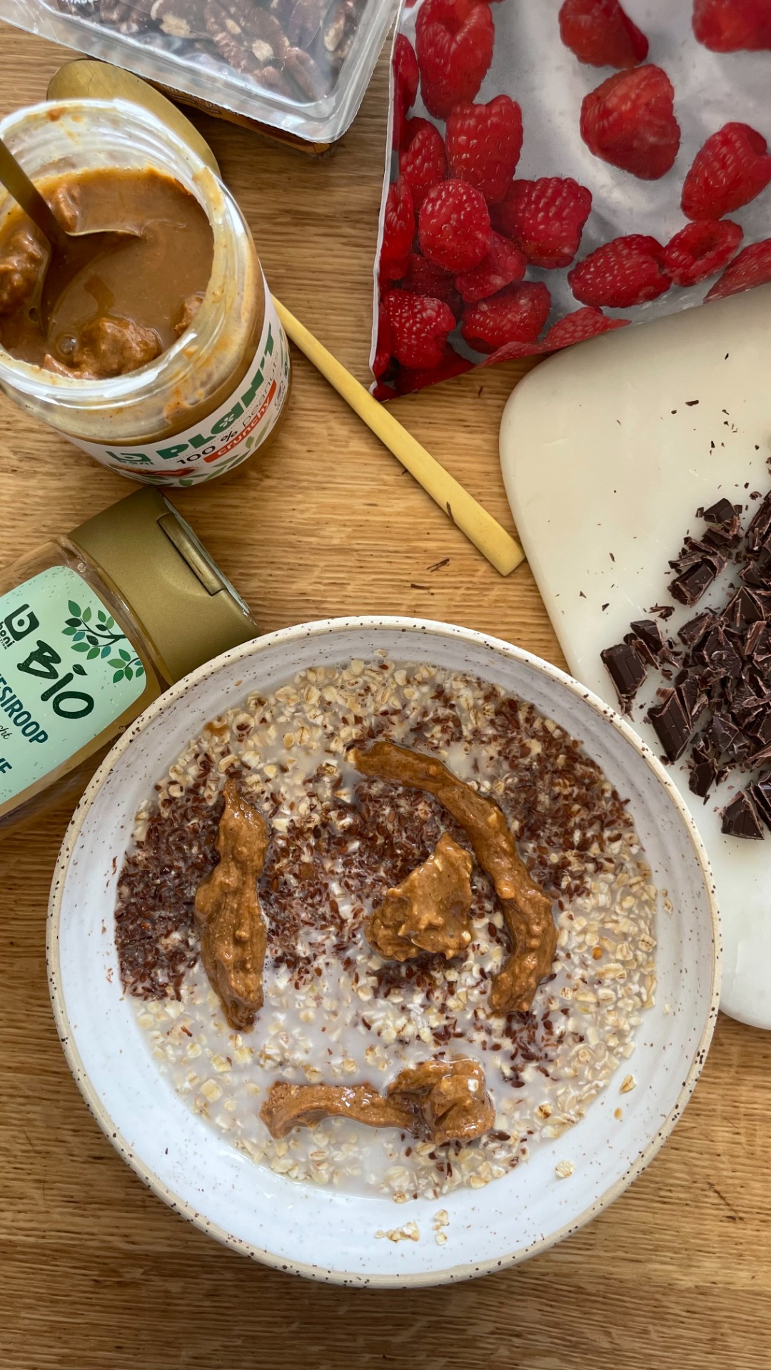 Doe de haver, rijstdrink (kan evengoed met een andere plantaardige 'melk' zoals haver of amandel), chocolade, het lijnzaad, agave (of maple syrup) en de peanutbutter met de frambozen in een diep bord of een kommetje. Zet zo'n 2minuten in de microgolf en werk af met wat gehakte nootjes en vers gemalen zeezout.